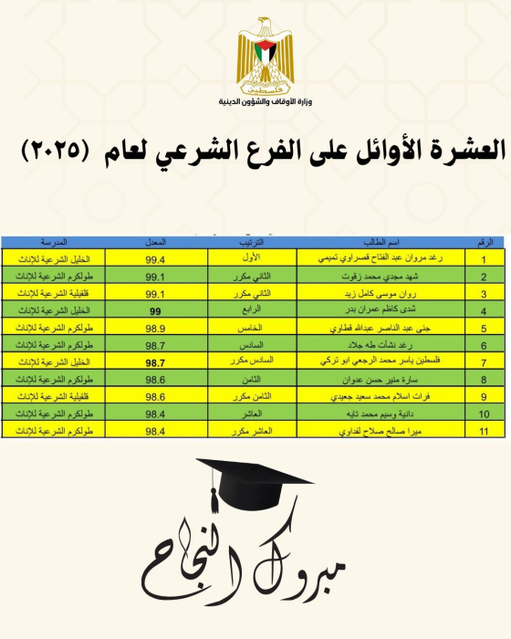 رام الله – أعلن سماحة الشيخ الأستاذ الدكتور محمد مصطفى نجم، وزير الأوقاف والشؤون الدينية، نتائج أوائل الثانوية العامة للفرع الشرعي للعام 2025 في فلسطين، مهنئًا الطلبة المتفوقين وذويهم على هذا الإنجاز الأكاديمي المشرف.